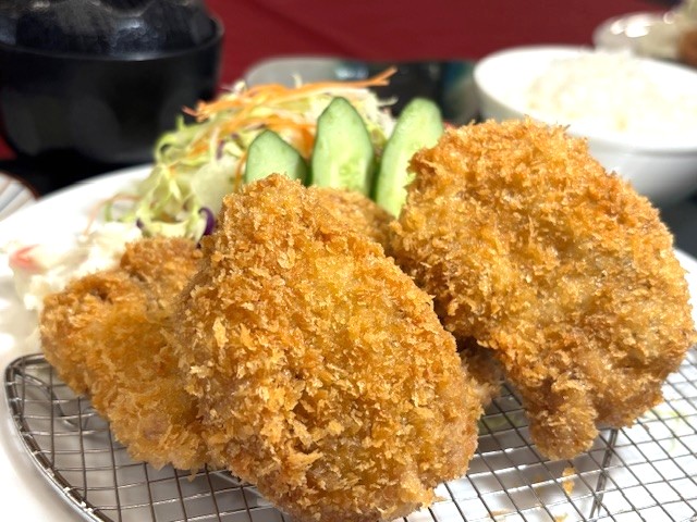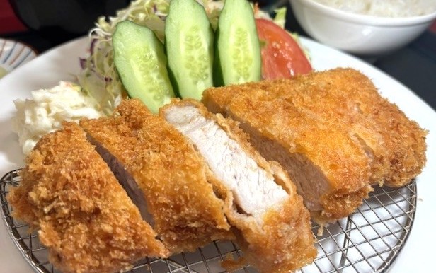- 県産Aロースをサクッとジューシーに仕上げております。Lサイズで食べ応え抜群。(ご飯・味噌汁・漬物付き)