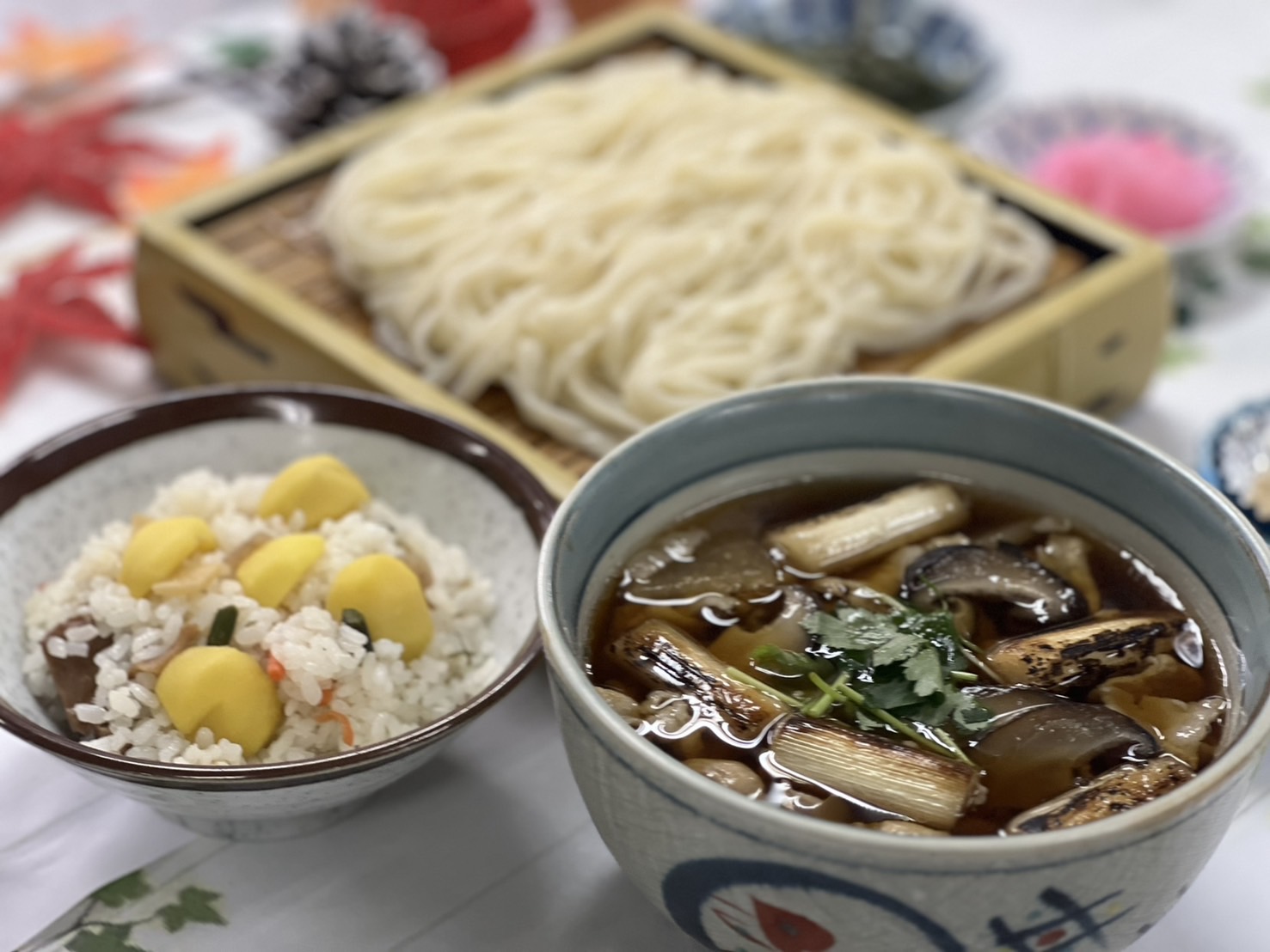 - (温)肉汁つけうどん・栗ご飯セット